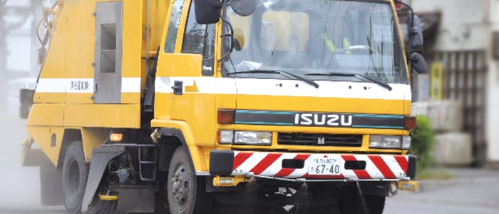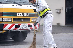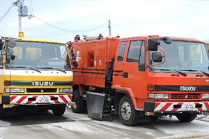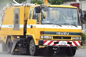 また、通常の清掃は先行車、散水車、路面清掃車(ロードスイーパー)及びゴミ運搬車(ダンプカー)の4台1組で行います。